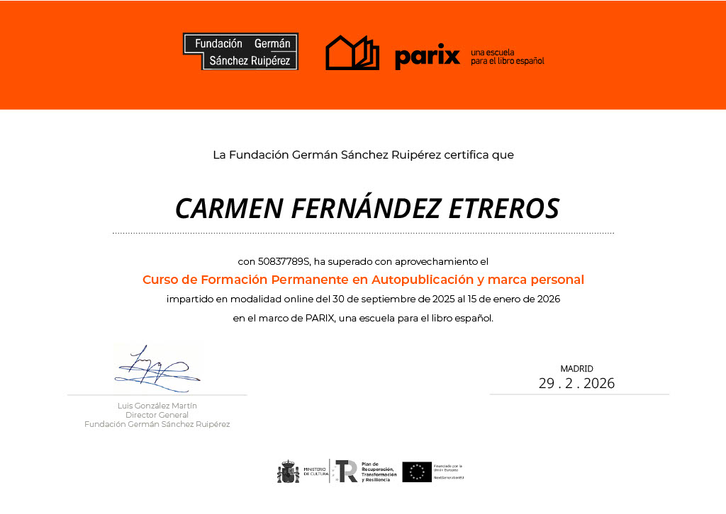 Certificado de la Fundación Germán Sánchez Ruipérez del Curso de formación permanente en autopublicación y marca personal impartido desde septiembre 2025 a enero de 2026.
